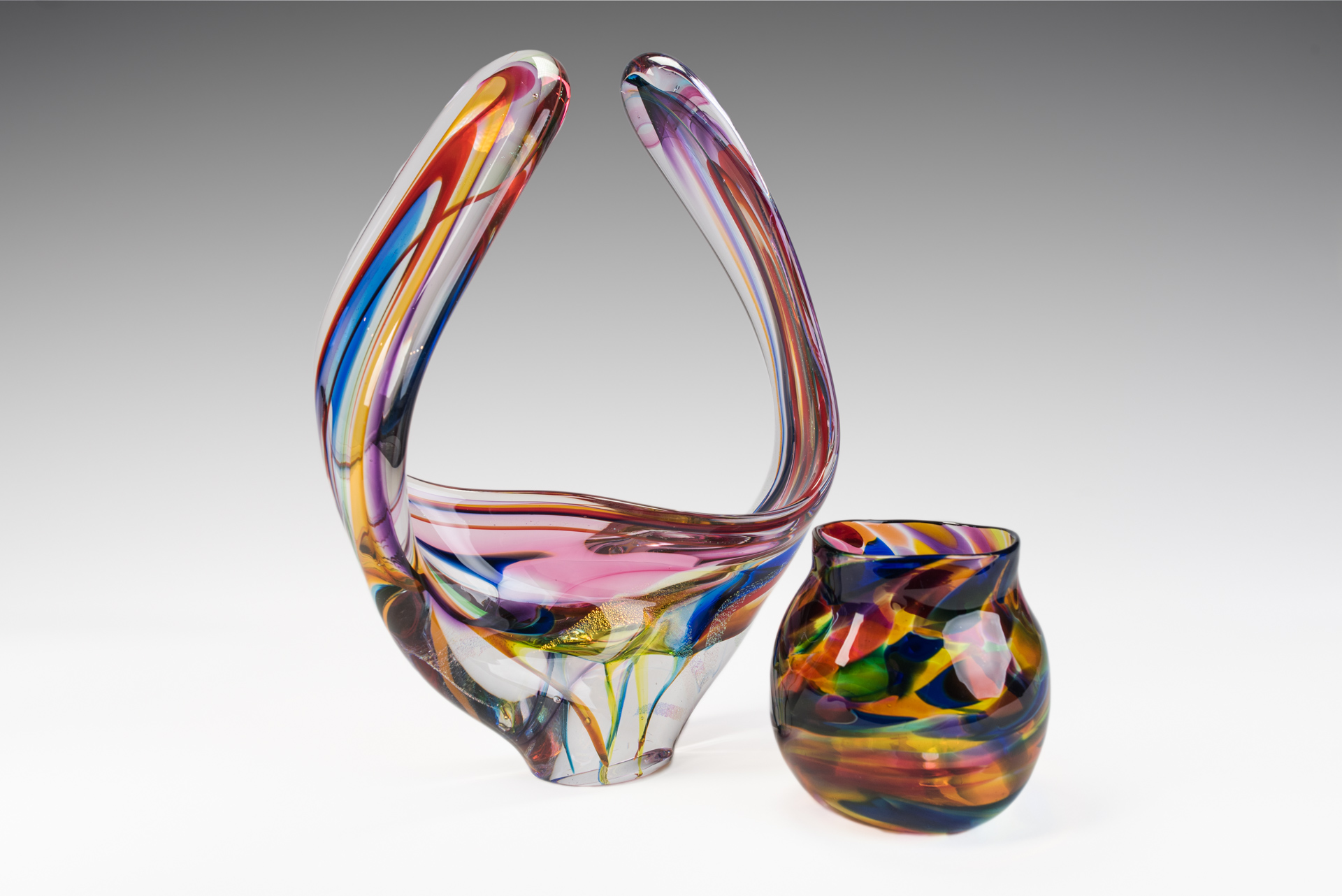 Among his sculptural glass works are asymmetrical biomorphic pods. These require unusual strength and adroit technique, with some exceeding 40 inches in diameter.